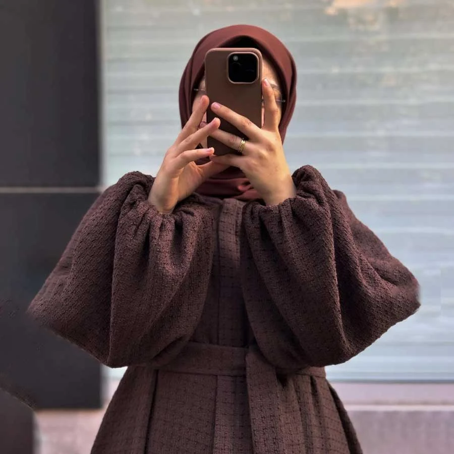 Elegant long winter ferace made from thick, high-quality fabric in a deep coffee-brown tone. Designed for warmth and sophistication