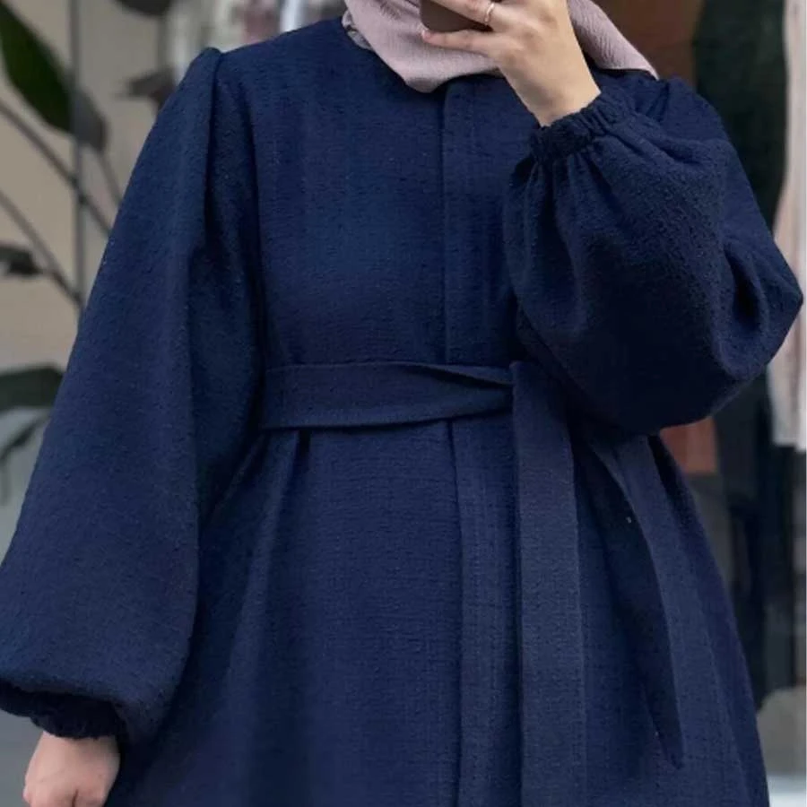 A warm, stylish winter ferace in navy blue, designed for comfort and elegance during cold seasons