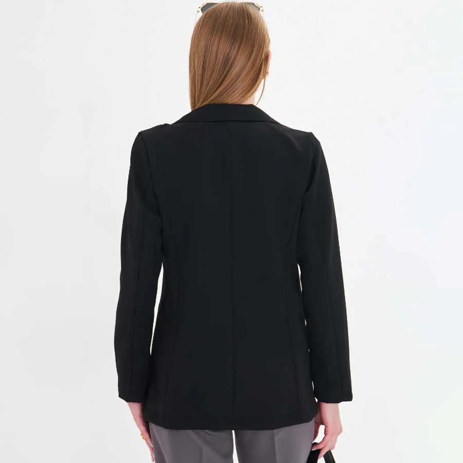 Black single-button jacket for women, designed for a sleek and versatile look suitable for both casual and formal outfits