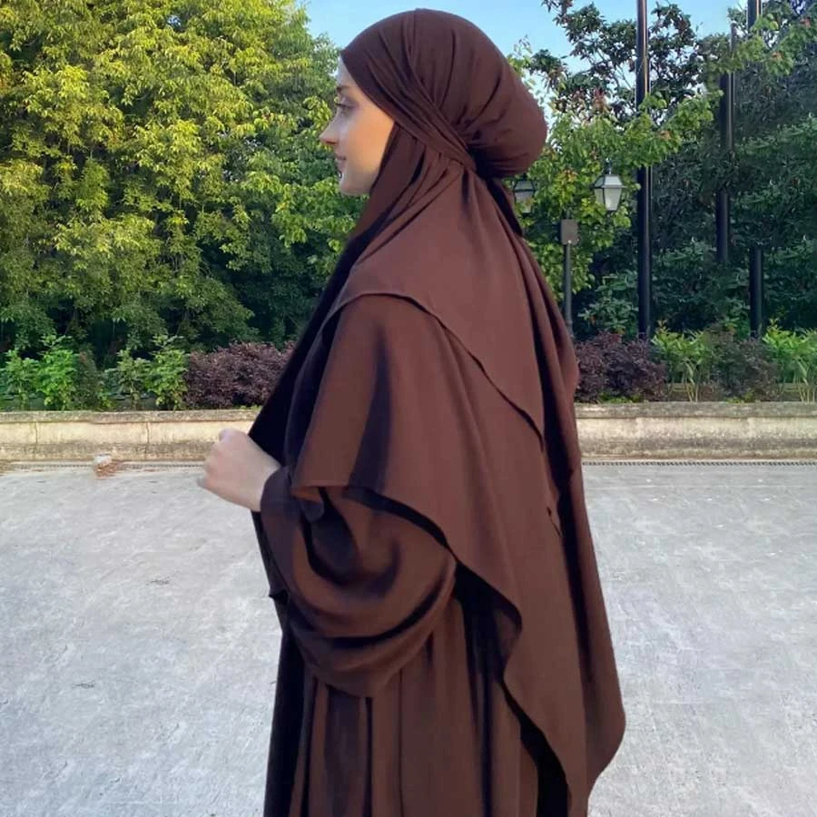 A luxurious three-piece ferace set in a rich bitter brown tone, featuring a souffle-textured fabric with a matching veil — designed for both elegance and comfort in modest wear