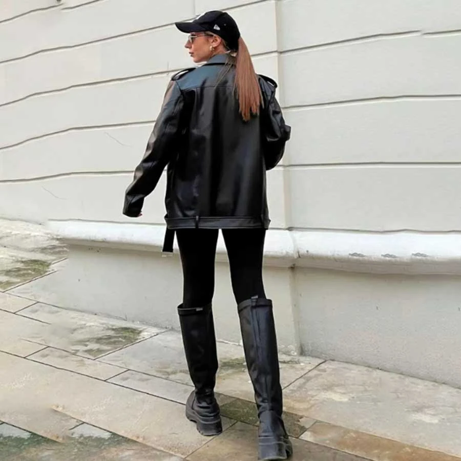 buqre’s moda Oversize Women’s Long Biker Leather Jacket