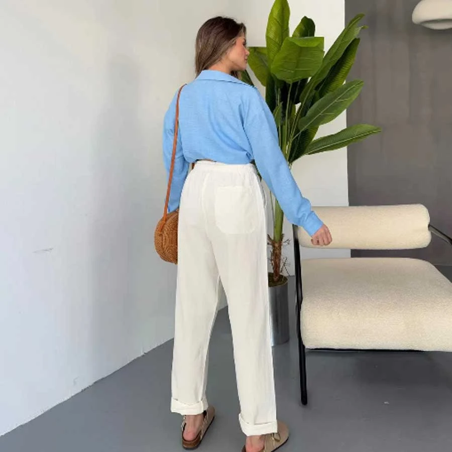 White linen trousers for women with a loose fit, regular leg cut, and normal waist
