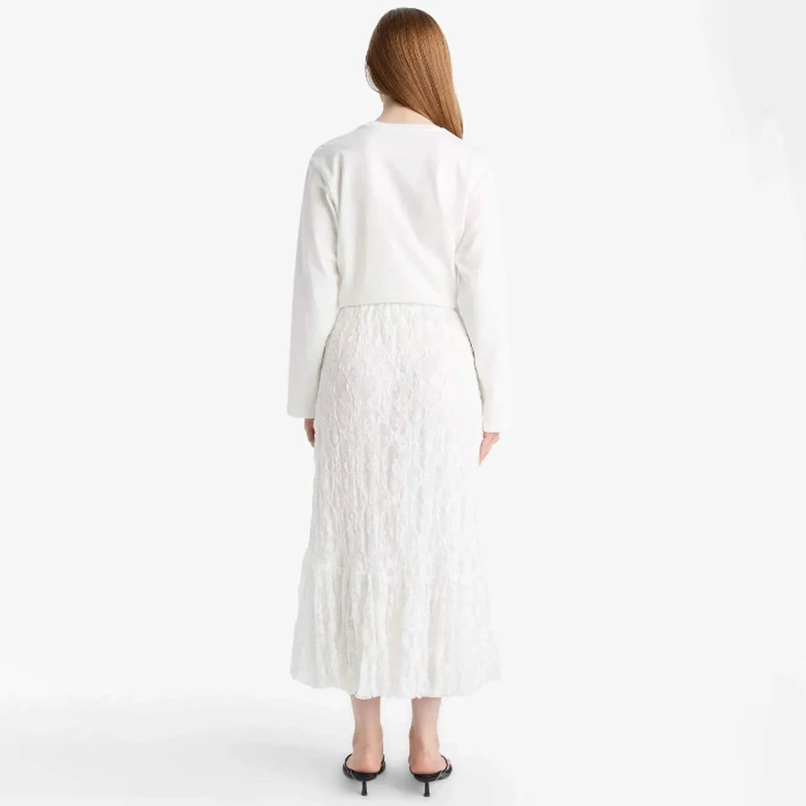 Elegant A-line midi skirt made from delicate lace fabric, offering a stylish and comfortable fit suitable for casual and semi-formal occasions