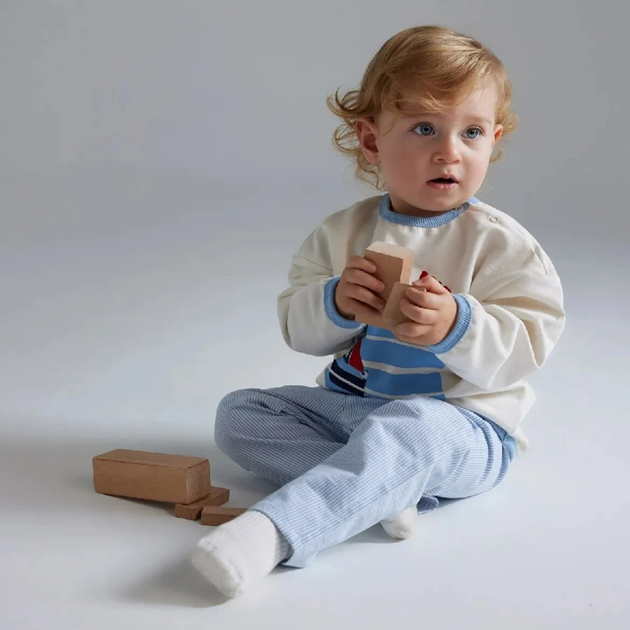 Soft cotton sweatshirt with fun prints paired with comfy striped bottoms, perfect for daily wear