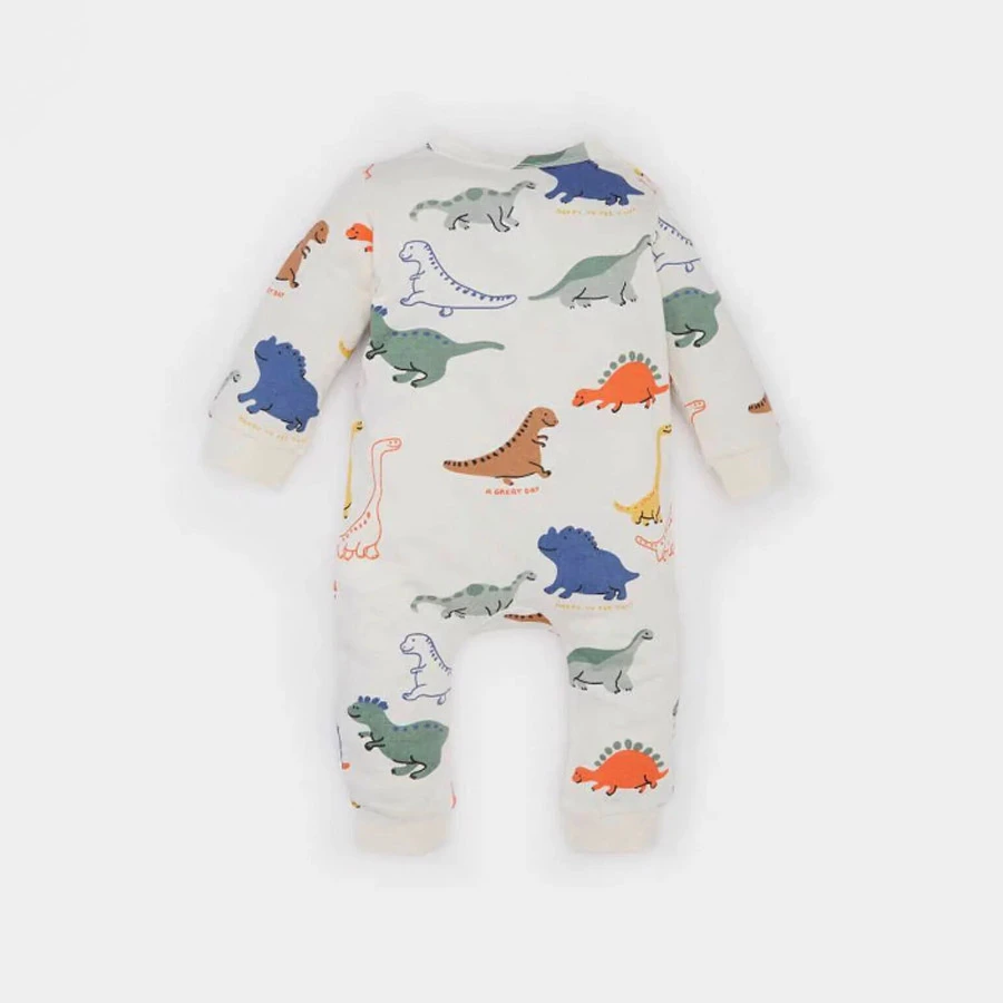 Adorable newborn romper made of soft combed cotton with snap fasteners for easy dressing, featuring a cute dinosaur print