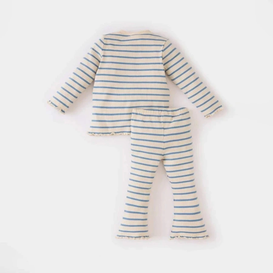 Adorable 2-piece outfit featuring a crew neck striped ribbed long-sleeve top with comfy Spanish leg waist bottoms