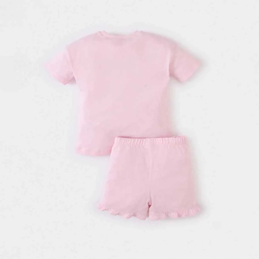 Two-piece baby girl set with a printed short sleeve t-shirt and elastic waist shorts, comfortable and playful for everyday wear