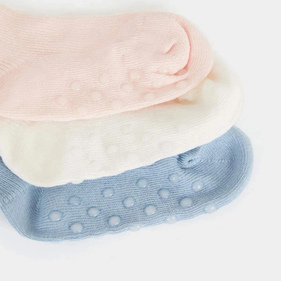 Set of 3 soft cotton socks with anti-slip soles, designed for baby girls. Comfortable and safe for everyday wear