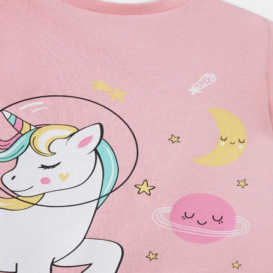 Cute unicorn-printed pajamas set for baby girls featuring a short sleeve top and elastic waist shorts made from soft combed cotton for comfortable sleep