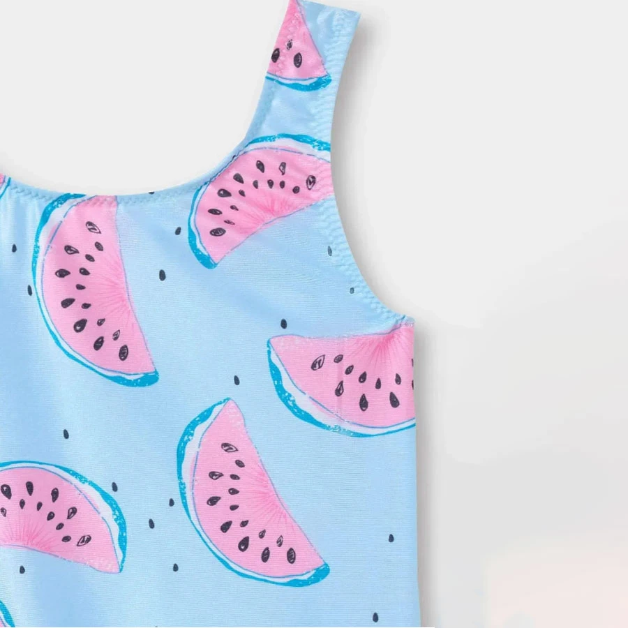 Adorable watermelon-themed swimsuit for baby girls made from soft, stretchy fabric ensuring comfort and fun at the pool or beach
