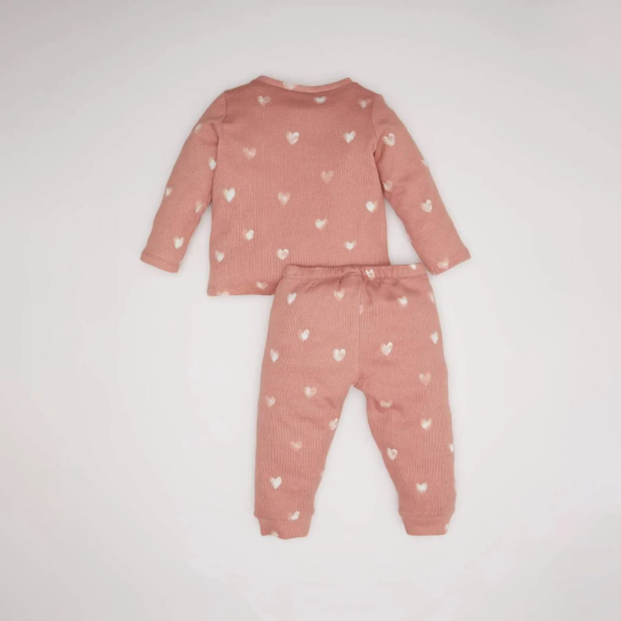 Defacto Baby Girls Pajamas Set – Heart Pattern Waffle Top & Elastic Waist Bottom
