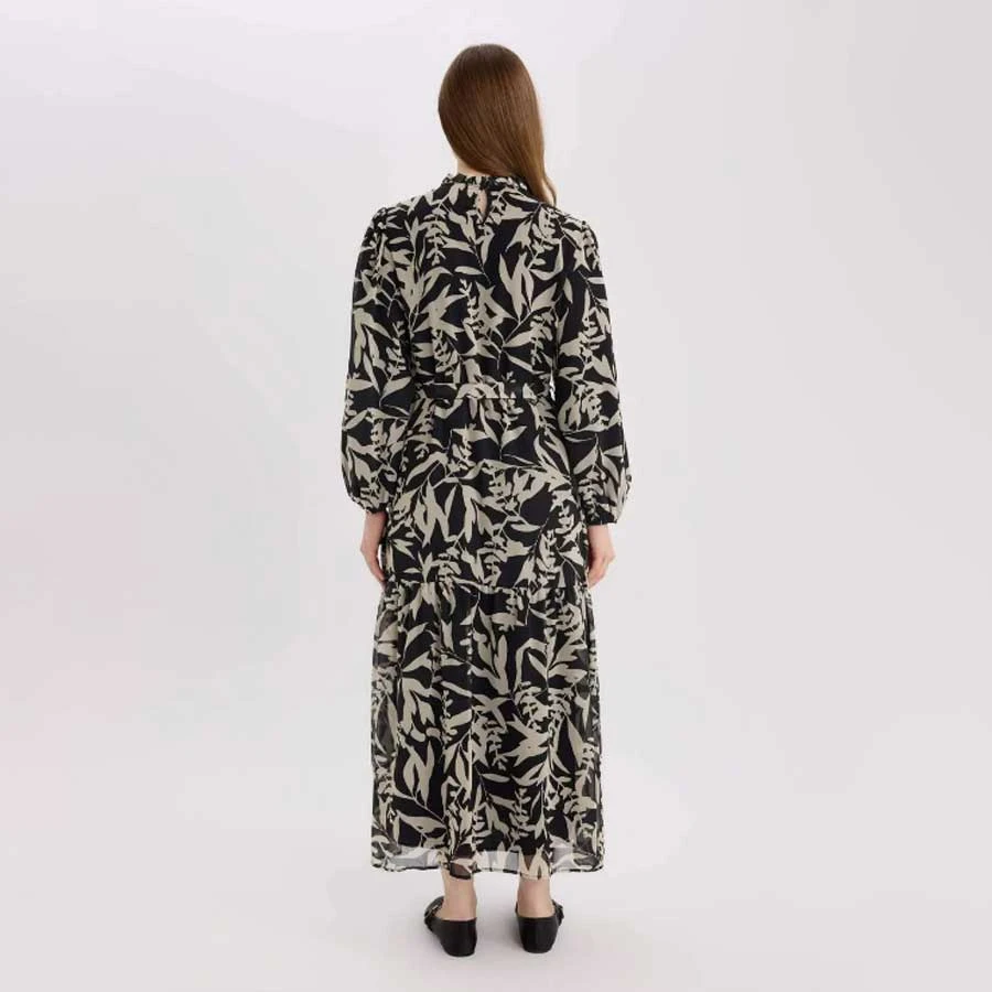 Defacto Crew Neck Print Chiffon Long Sleeve Maxi Dress