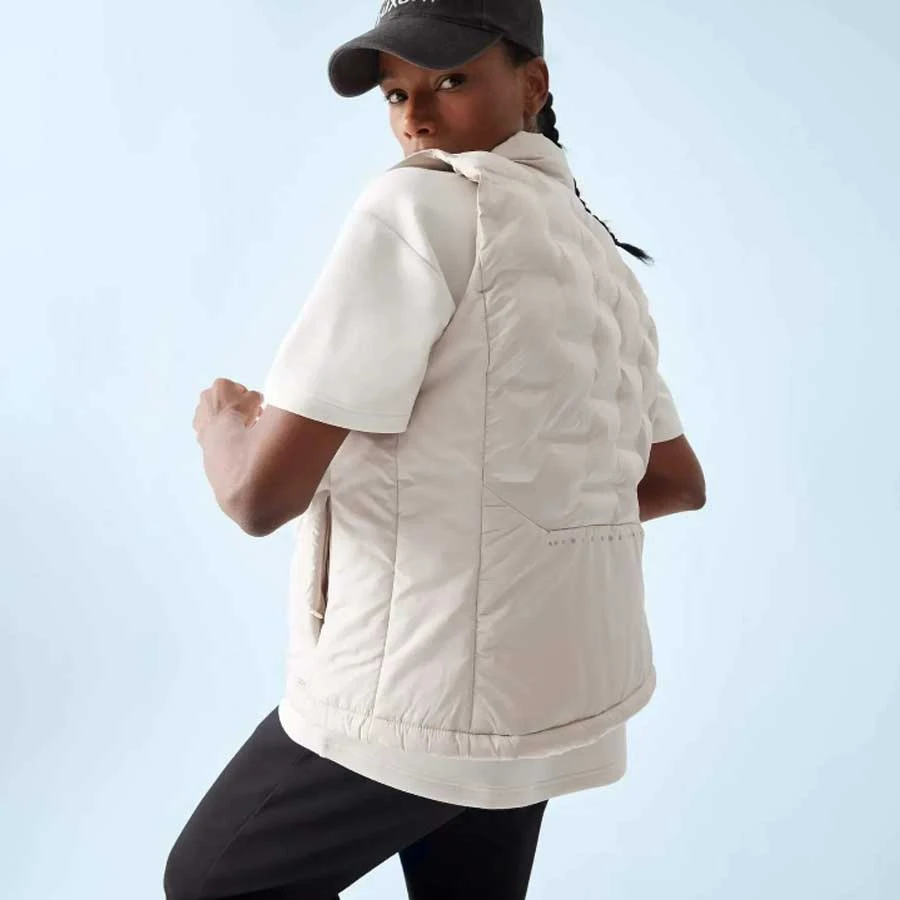 Water-repellent quilted sports vest with a stand collar and zipper closure, designed for warmth, comfort, and sporty style