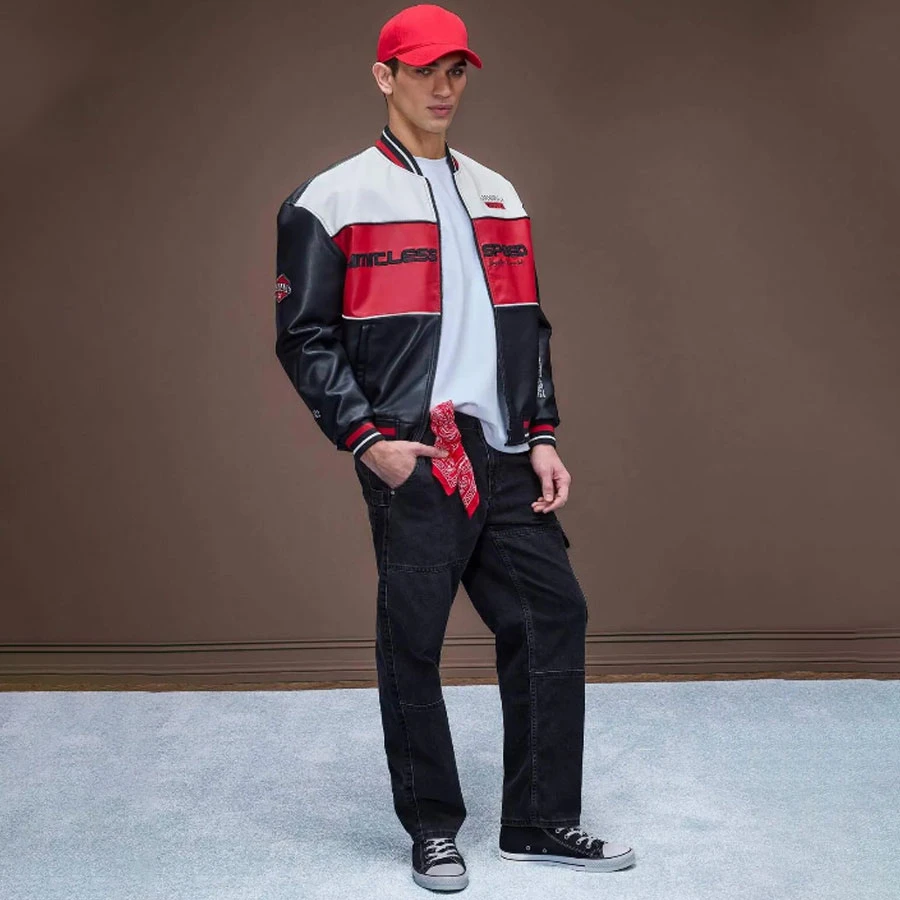 Oversize faux leather bomber coat designed with a college collar and zip pockets, offering a trendy look and practical seasonal protection