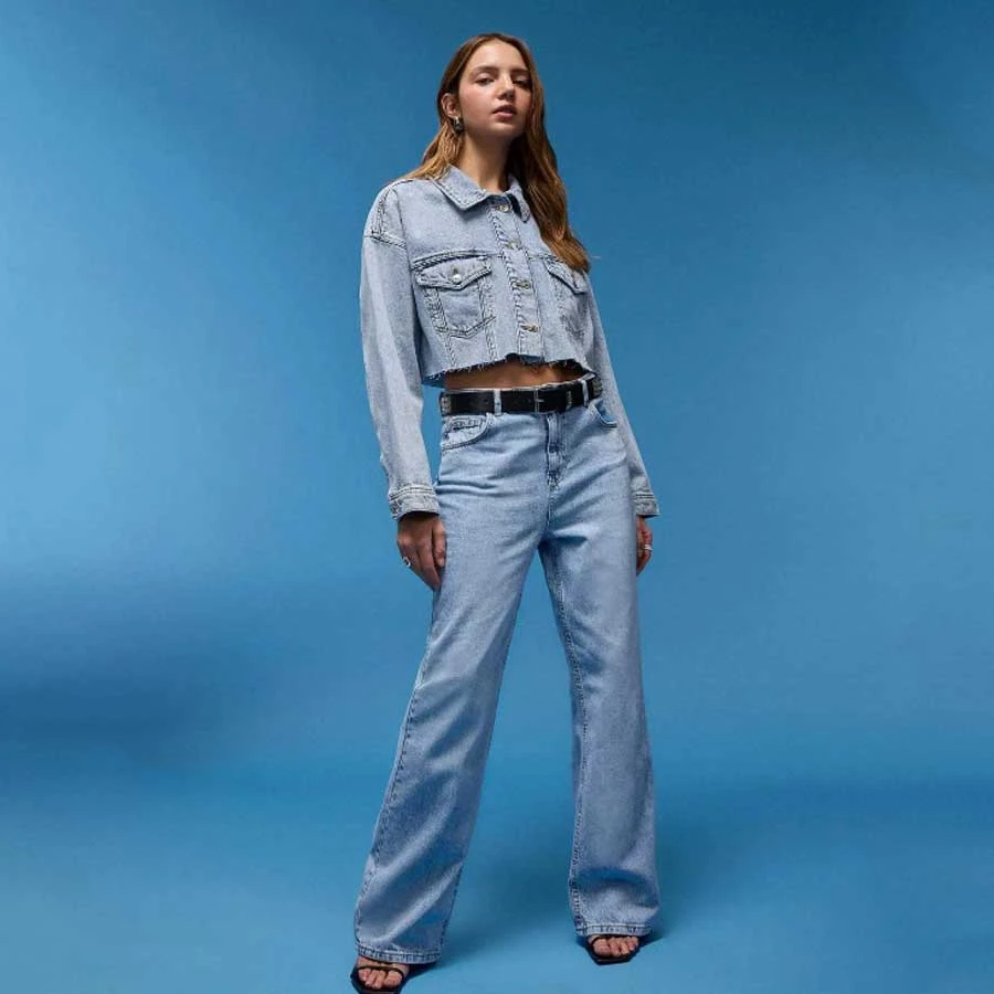 Cropped jean jacket with a modern fit, designed for casual styling and layering