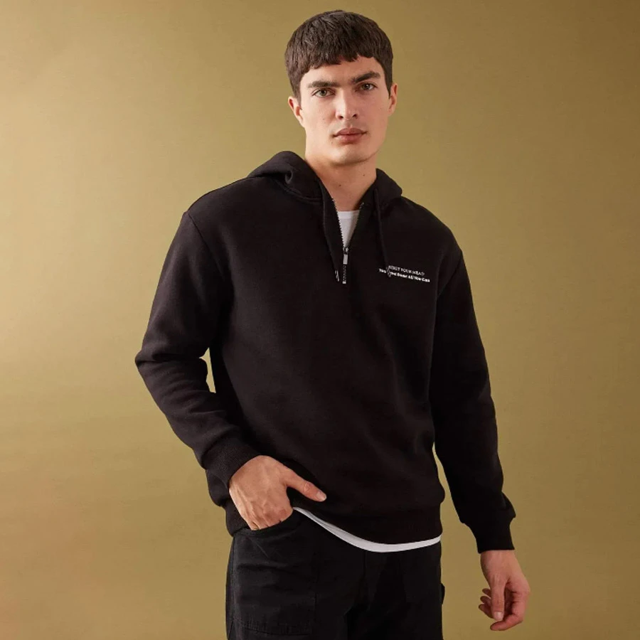 Defacto Oversize Wide Fit Half Zipper Hooded Back Printed Sweatshirt