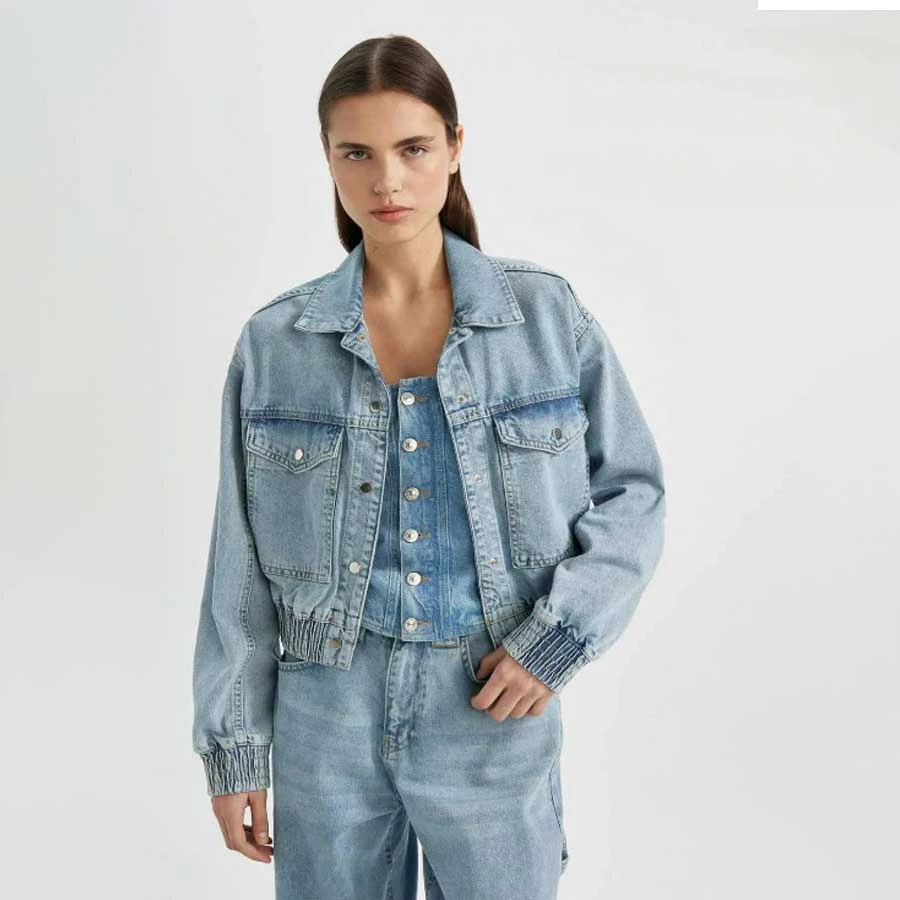 Jean bomber jacket featuring a polo collar, button pockets, and casual fit, perfect for stylish everyday layering
