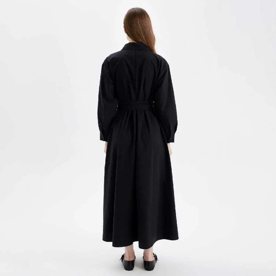 Defacto Poplin Shirt Collar Maxi Black Dress with Belt and Long Sleeves