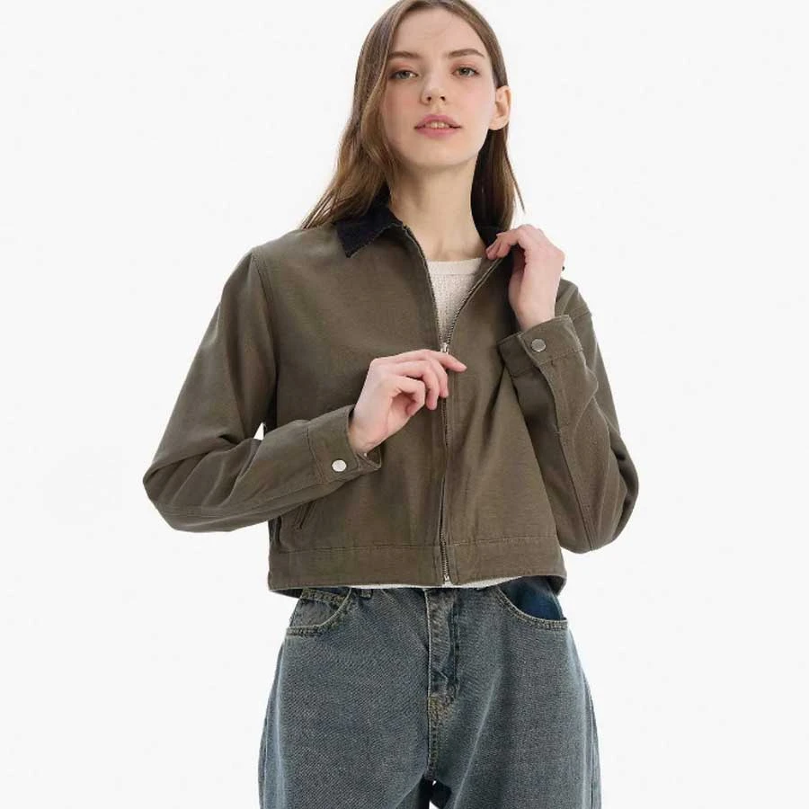 A casual cotton jacket with a contrast collar, zip closure, and plain design with side pockets. Lightweight and suitable for seasonal wear
