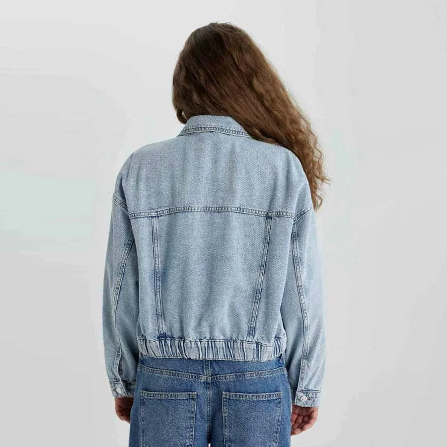 Jean bomber jacket with a shirt collar, button pockets, and casual relaxed fit, perfect for stylish everyday layering