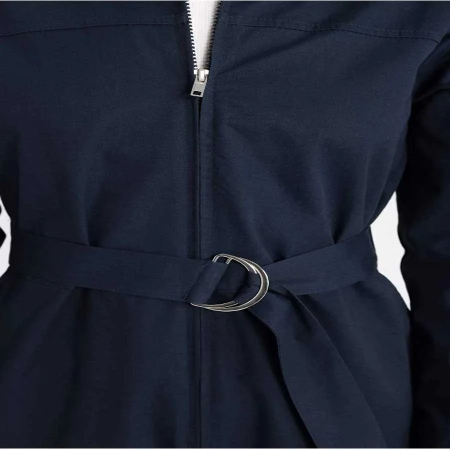 Long sleeve hijab jumpsuit made from gabardine fabric, featuring a shirt collar and belt for a modest yet stylish look