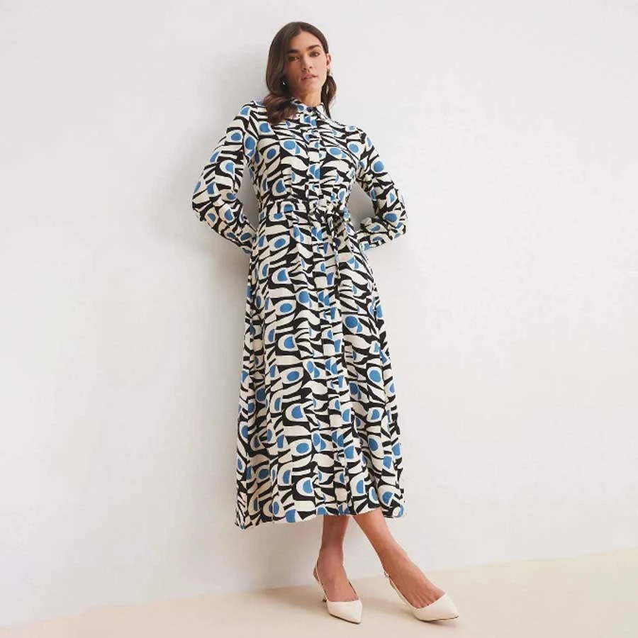 Defacto Shirt Collar Patterned Belted Long Sleeve Maxi Hijab Dress