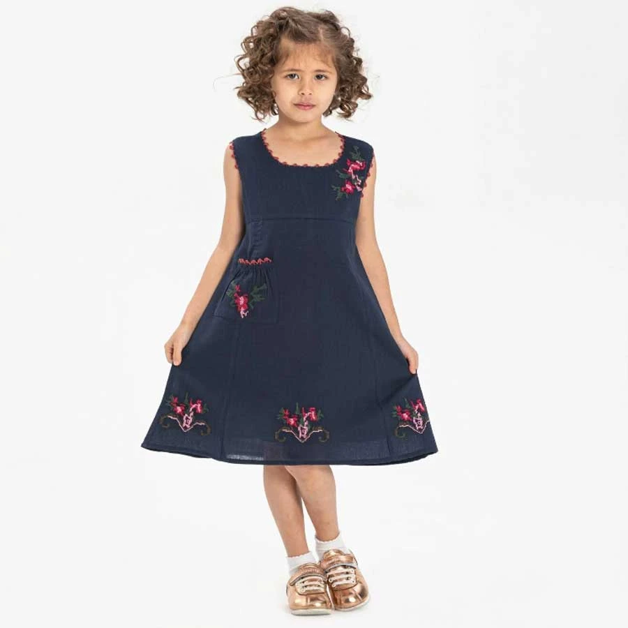 Girls’ summer dress made from breathable Şile cloth, featuring a navy blue color and a comfortable fit