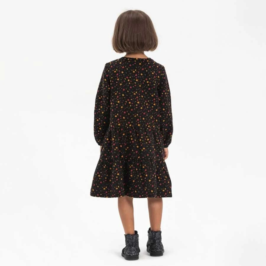 Black flannel children’s dress with long sleeves and a crisp pattern, designed for comfort and style