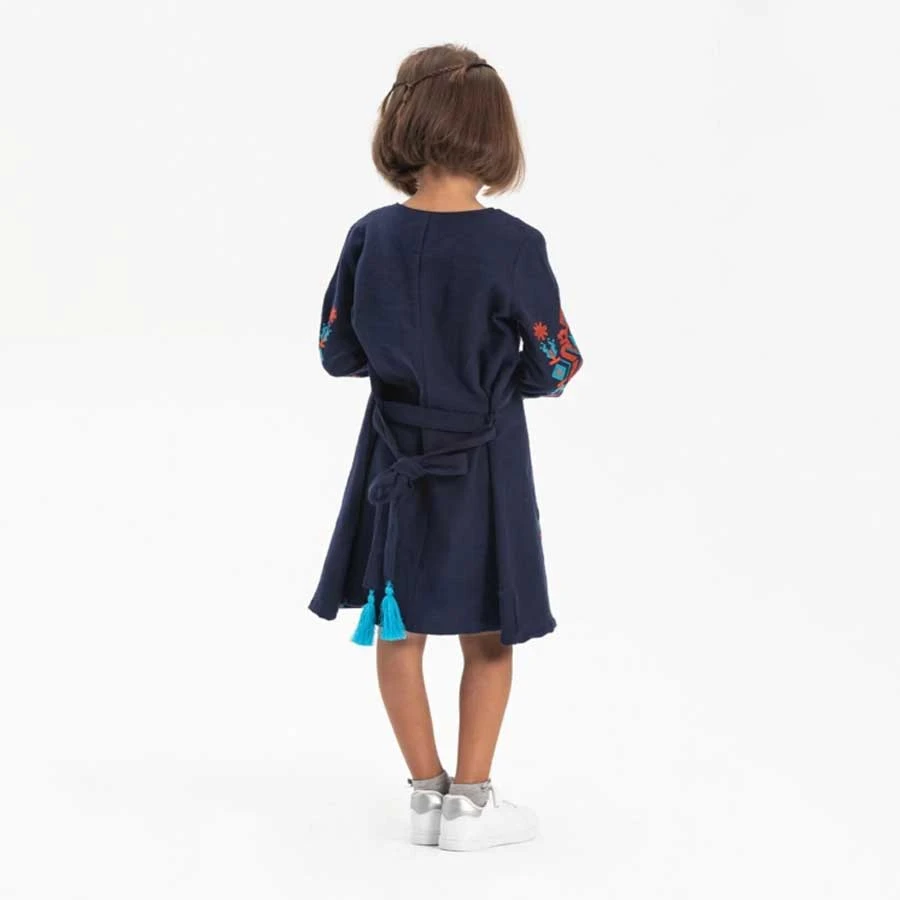 Navy blue flannel baby dress with long sleeves, designed for comfort and warmth