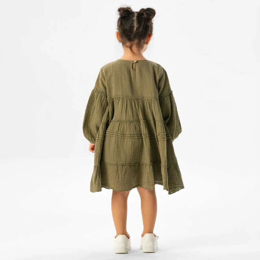 Lightweight khaki muslin dress for children, featuring long sleeves for sun protection and comfort