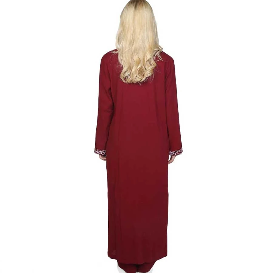 Seasonal long ferace in burgundy, made from Shile cloth with long sleeves, judge collar, and ring embroidery detailing. Designed for elegance and comfort