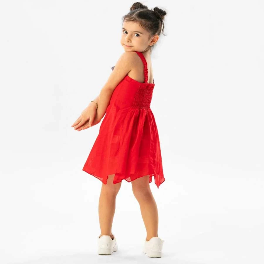 A charming red strappy summer dress made from lightweight voile fabric — perfect for warm days
