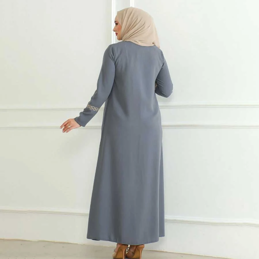 A graceful full-length ferace made from premium crepe fabric, featuring delicate embroidery and a smooth zipper closure