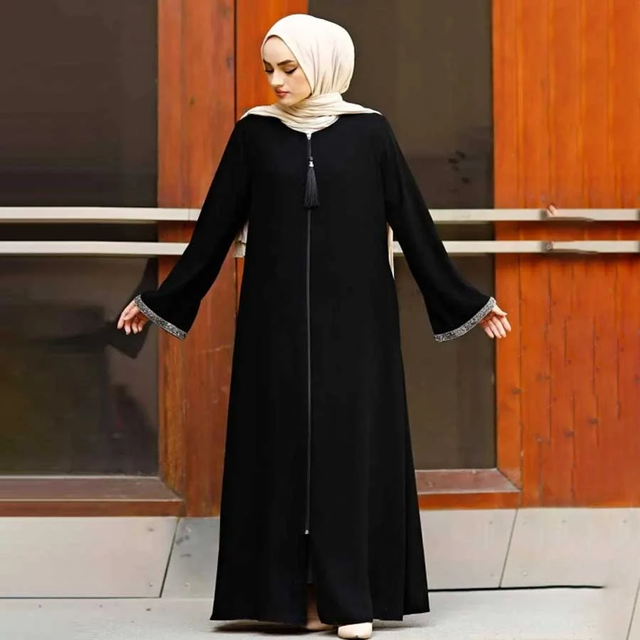 A stunning full-length ferace featuring elegant jeweled sleeve details and a smooth zipper closure. Made from high-quality Turkish crepe fabric, it combines sophistication with modest style