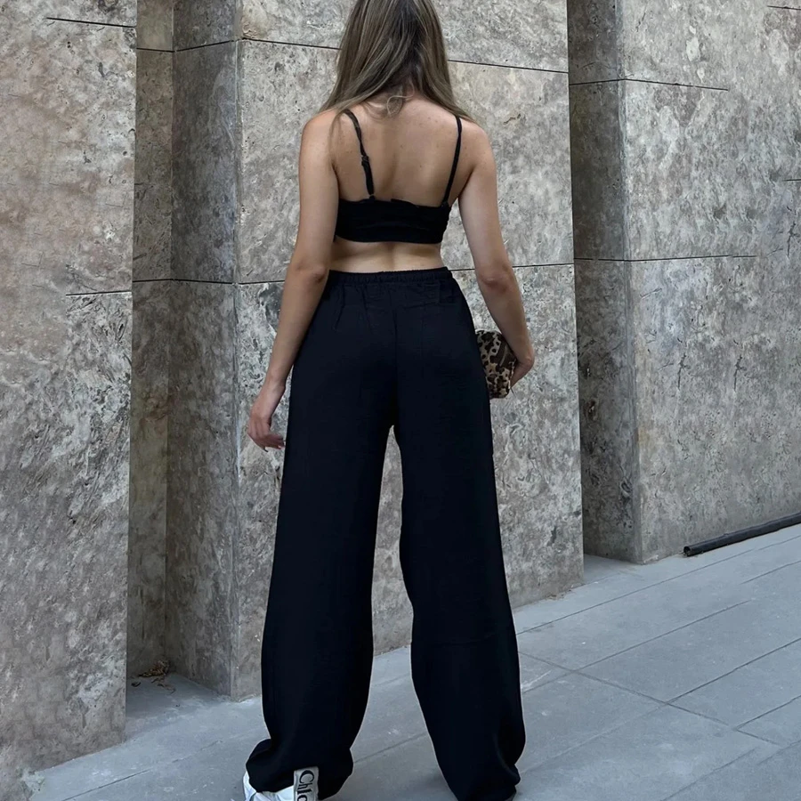 بنطلون أسود فضفاض مصنوع من مزيج الكتان القابل للتنفس، يتميز بحزام خصر مطاطي للراحة وملاءمة مريحة مناسبة للارتداء غير الرسمي
