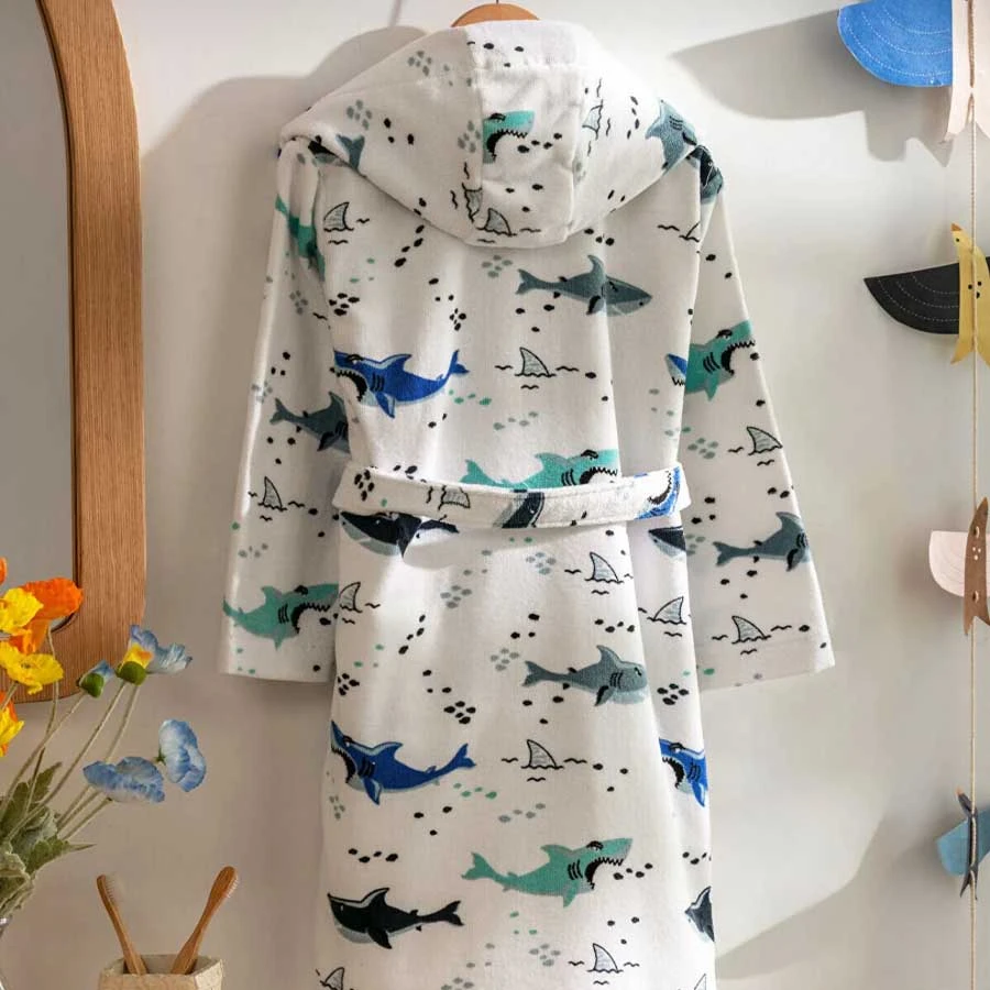 Comfortable hooded bathrobe with fun mixed prints, ideal for keeping warm after bath time