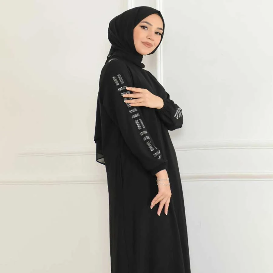 Stylish black abaya with stone detailing, perfect for a modern and elegant look