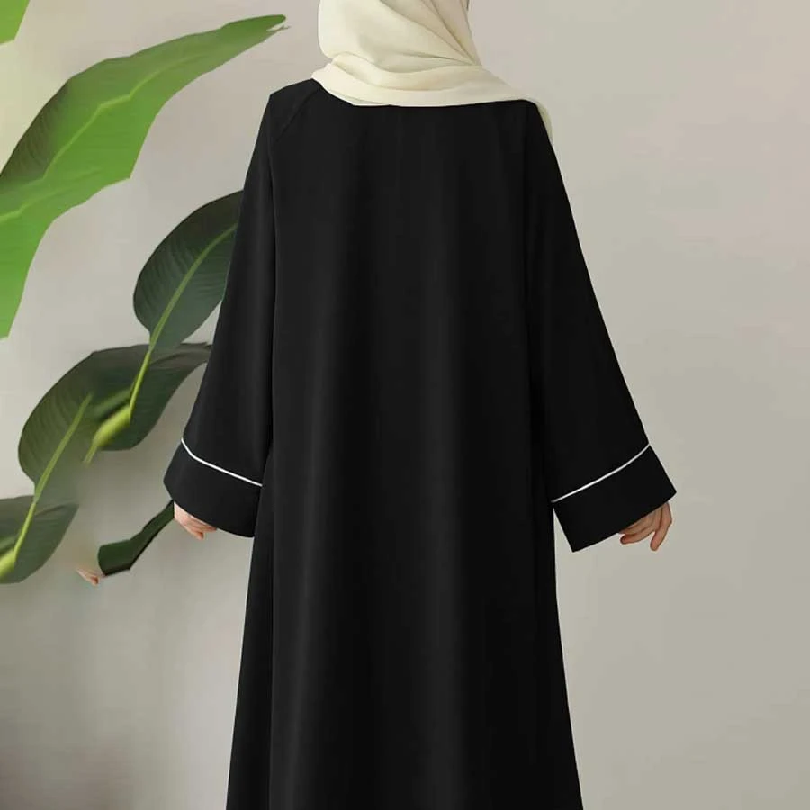 Elegant black abaya-style ferace with a bias-cut design, offering a graceful flow and modest sophistication for any occasion