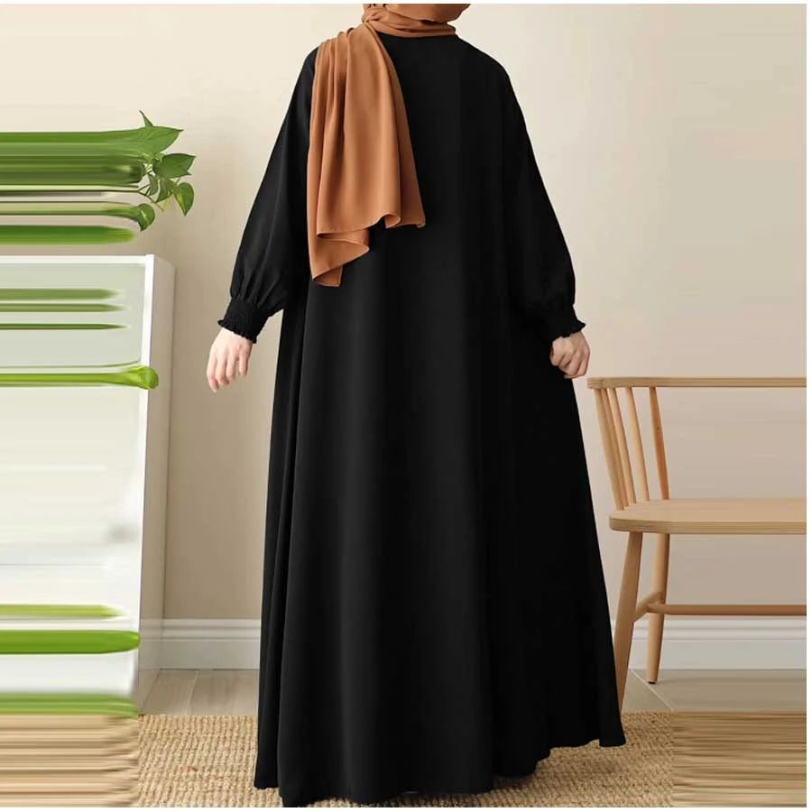 Elegant flared black ferace from Suhneva, featuring a flowing Mevlana cut and modest, graceful design suitable for daily or special occasions