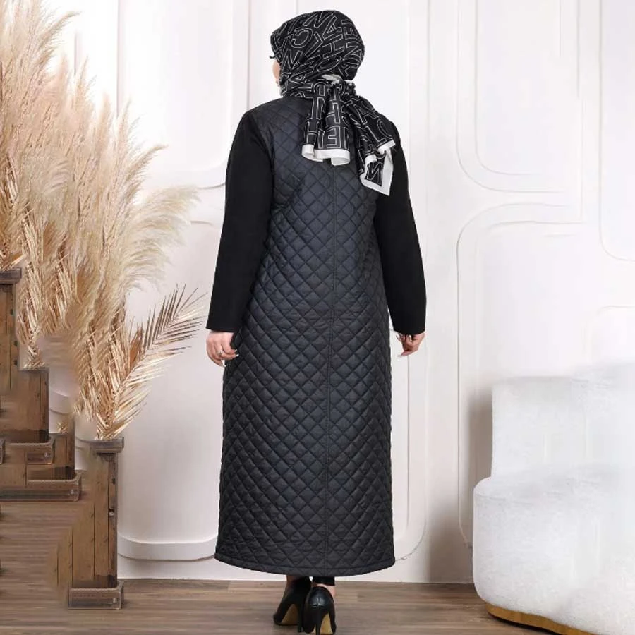 Tuğralı Quilted Zippered Black Coat – Full-Length Hijab Winter Overcoat