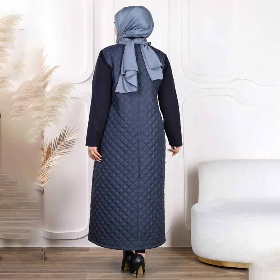 Tugrall Quilted Zippered Navy Blue Coat Hijab Full-Length Overcoat
